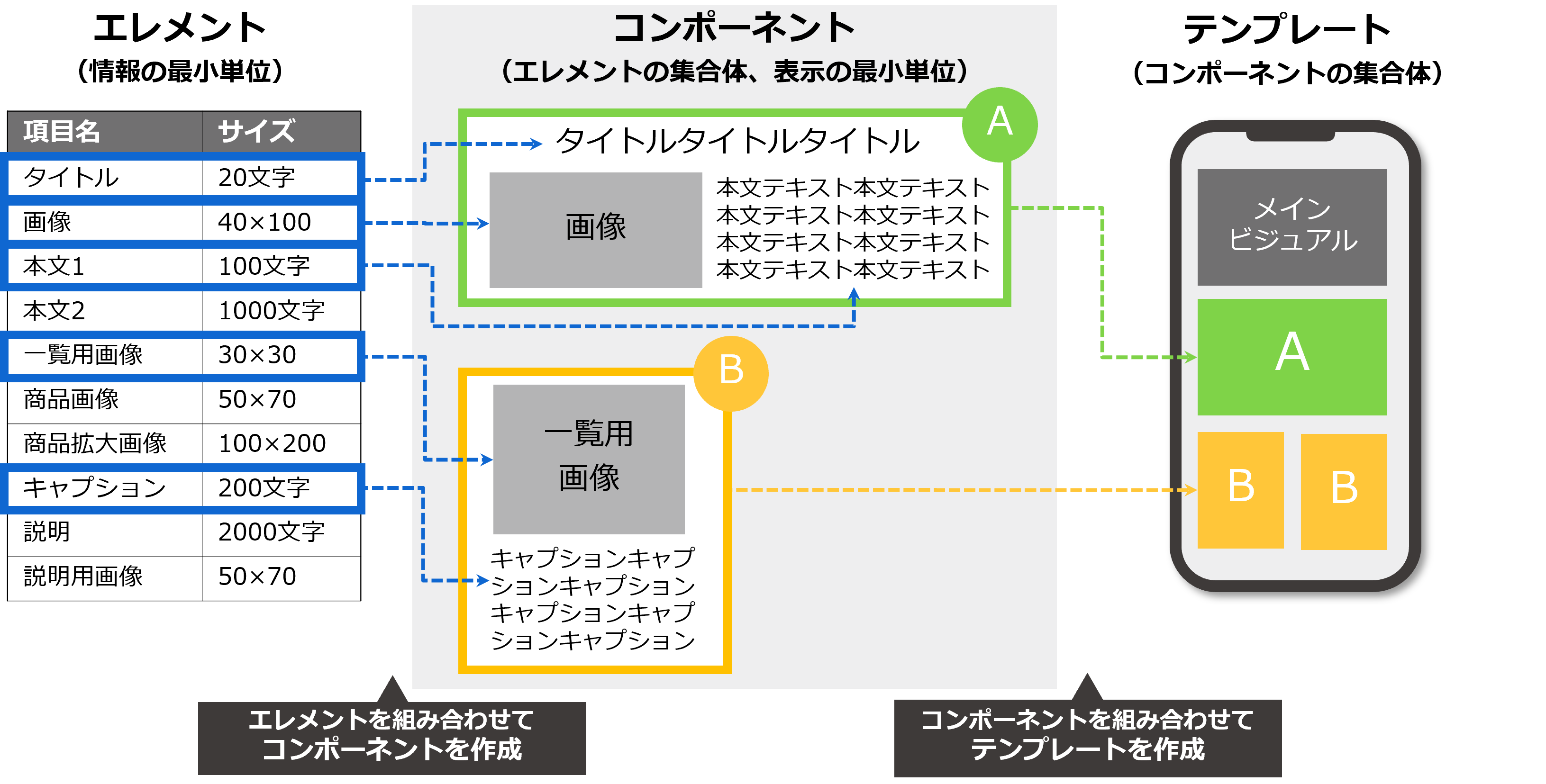 大規模Webサイトの場合、CMSでWebサイトを制作することが多いですが、Webサイト設計段階で作成するコンテンツのレイアウトを決め、コンポーネントを設計します。